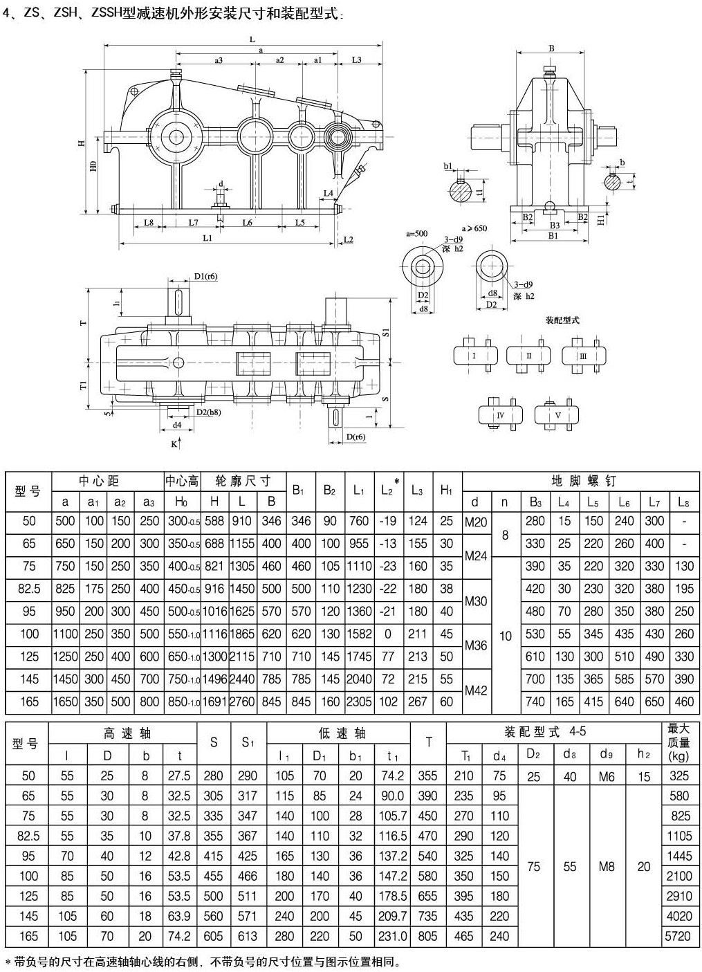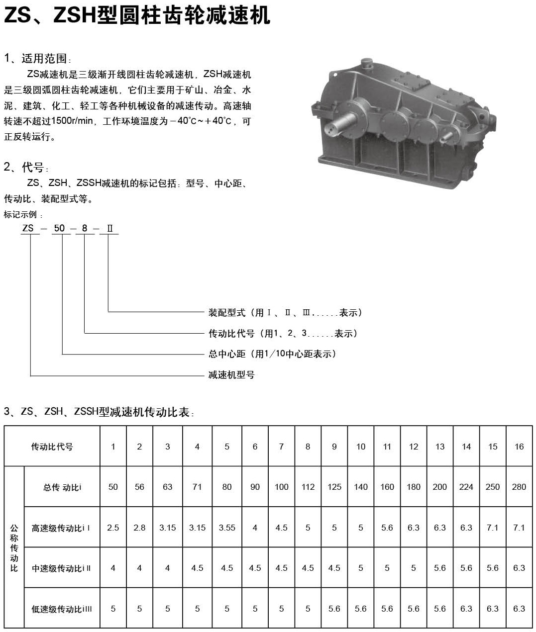 ZS,ZSH型減速機(jī)主要用于超重,礦山,通用化工,紡織,輕工等行業(yè),其適用條件如下:減速機(jī)齒輪傳動圓周速度不大于4米/秒;高速軸的轉(zhuǎn)速不大于1500轉(zhuǎn)/分;用于正反兩向運轉(zhuǎn);工作溫度為-40度至40度。九種傳動比,九種配置形式和三種低速軸端型式。 型號標(biāo)記示例:ZS(ZSH) - 500-5- II ZS(ZSH)是減速機(jī)型號,500是總中心距,5是傳動比代號,II裝配形式。
